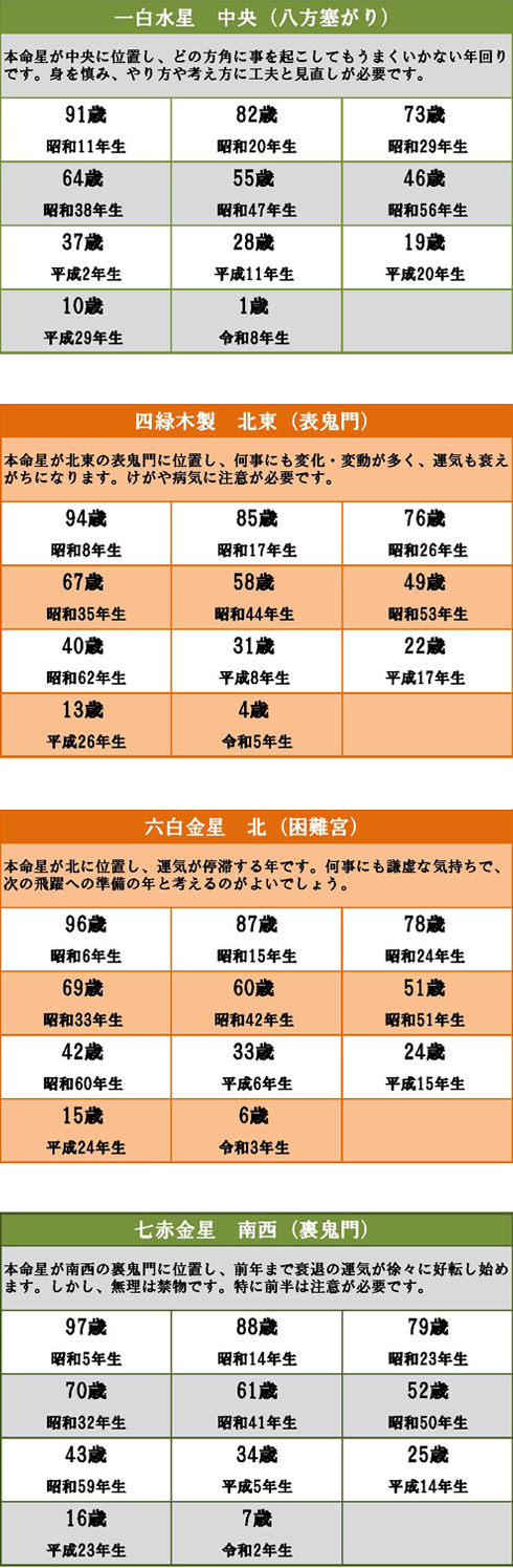 方位除けには大きく分けて2つの種類があります。1つは「年回り」による方位除けで、人が生まれながらに持っている本命星が、その年に方位盤のどの方向に位置しているかで吉凶を占います。下の表は、この「年回り」により、特に注意しなければならないとされる年齢を一覧表にしたものです。そして、もう一つが転居や旅行など、文字通り行く先の「方角・方位」による災いを防ぐための方位除けです。方位除けのお祓いを受けて、大難を小難に、小難を無難に収めます。